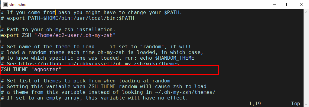 아래의 이미지와 같이 ZSH_THEME 부분을 agnoster로 변경하여 줍니다.