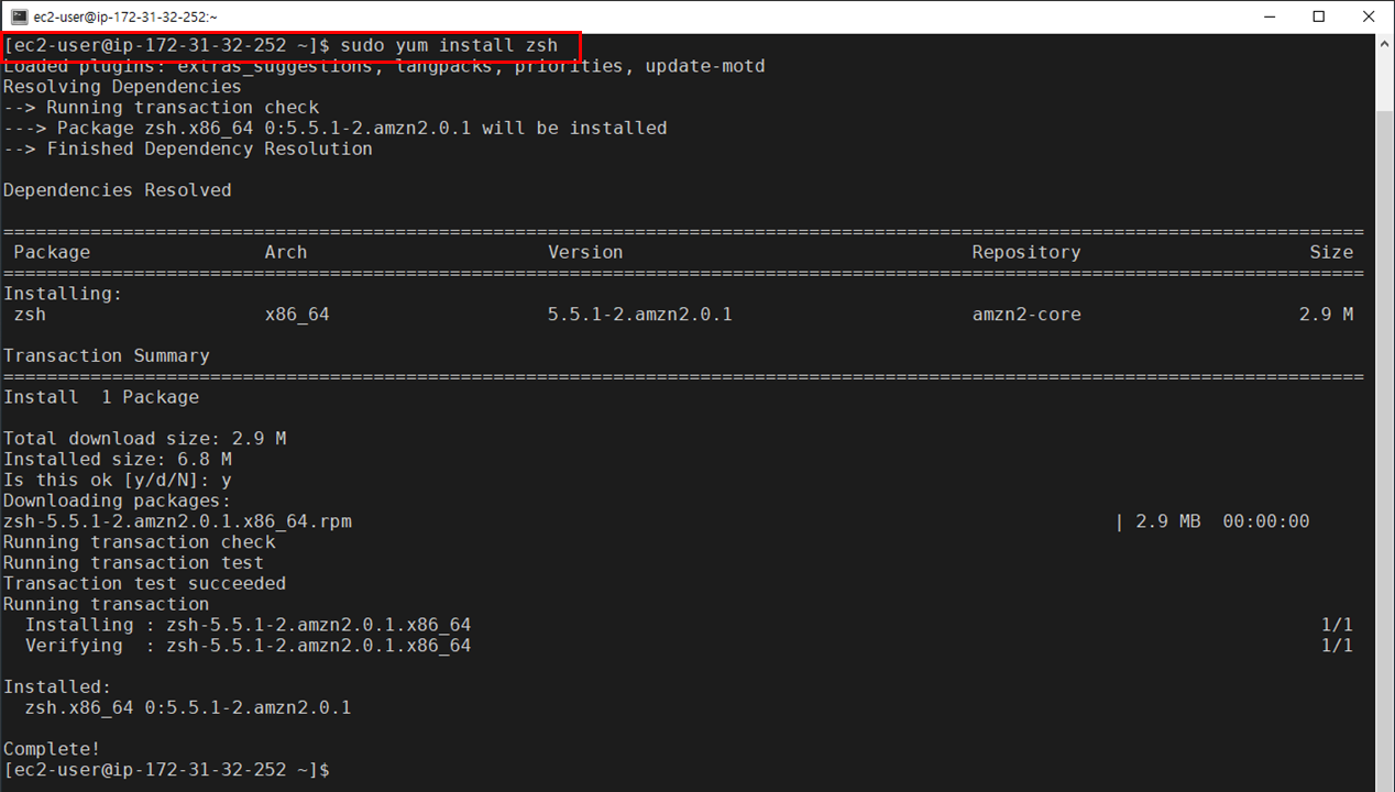 zsh가 아닌 다른 쉘(ex. bash)로 되어 있고 이전에 Zsh를 설치한 적이 없다면 AWS Linux 2에 아래의 명령어로 Zsh를 설치해 줍니다.