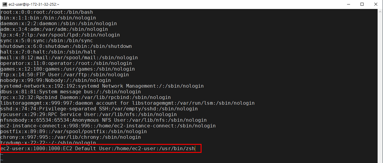 여기서 맨 아래에 보면, ec2-user의 기본 쉘이 /bin/bash로 되어 있는 것을 확인할 수 있습니다.