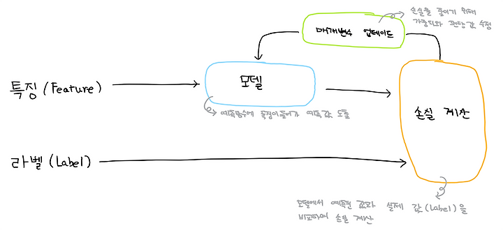 위의 그림은 머신러닝에서 반복 방식이 동작하는 과정을 나타낸 그림입니다. 그 과정을 풀이하면 다음과 같습니다.